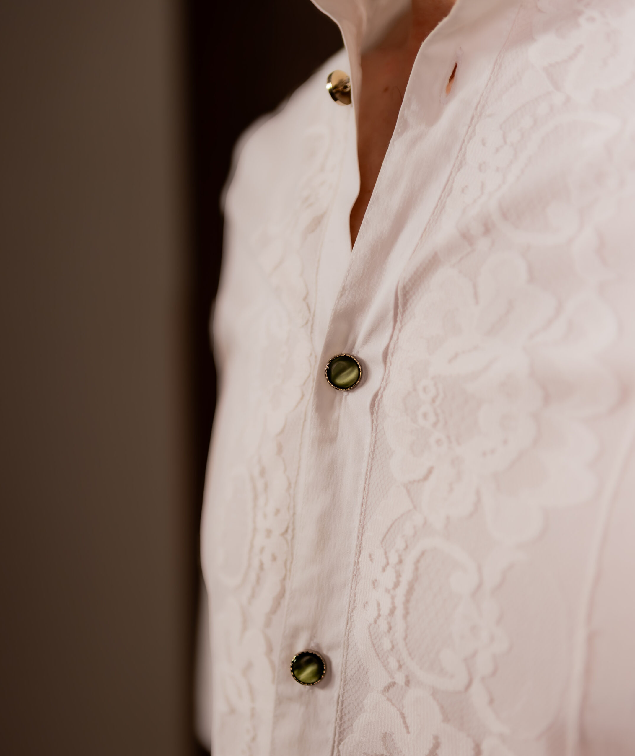 Camisa rescatada y transformada con un cuidado meticuloso, enriquecida con encajes antiguos, delicados y elegantes y botones antiguos, resina color esmeralda, que encierran memoria y artesanía.