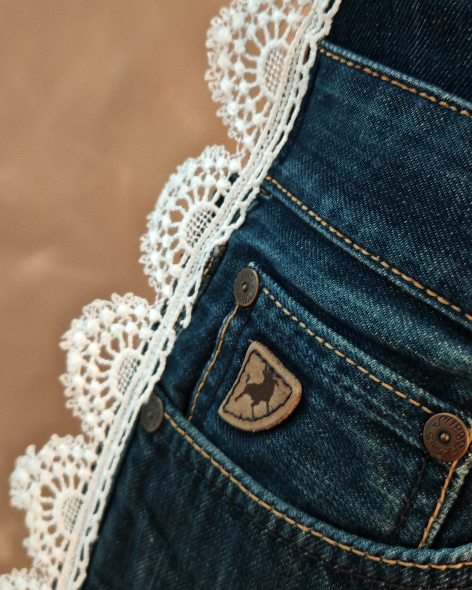 Confeccionado a partir de tejidos reciclados de antiguos pantalones vaqueros y pasamanería recuperada de un antiguo juego de toallas, reflejan la transformación de lo viejo en belleza.