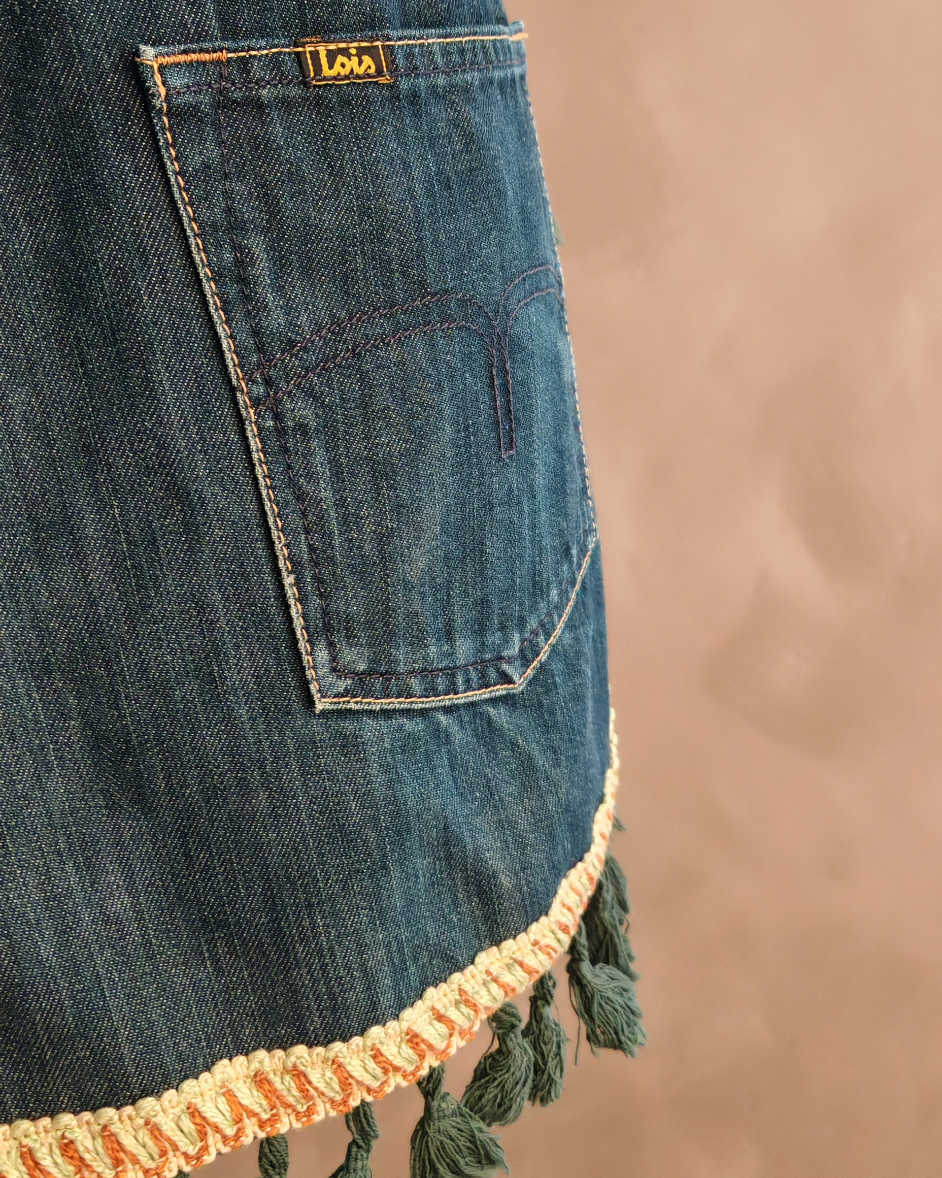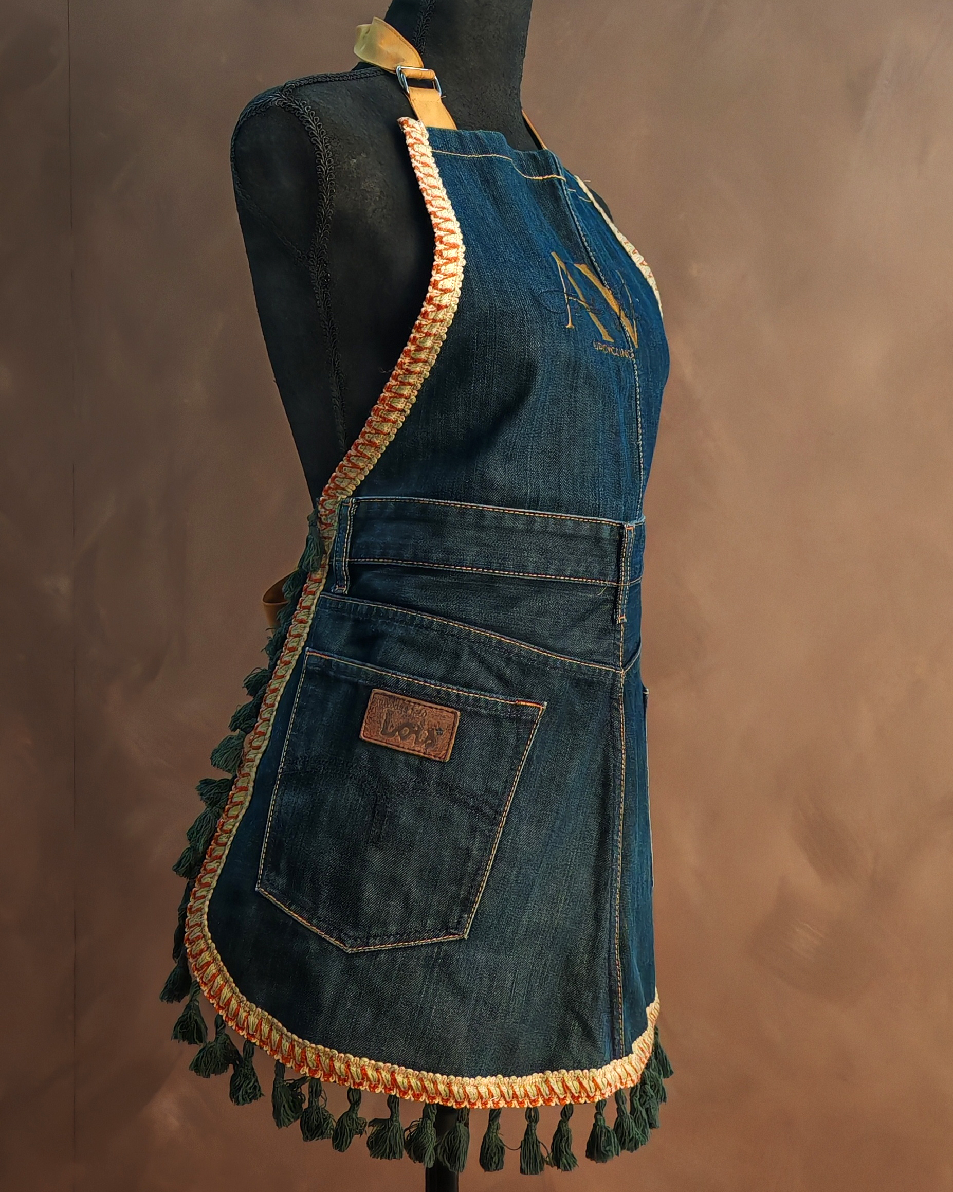 Confeccionado a partir de tejidos reciclados de antiguos pantalones vaqueros y pasamanería recuperada de una antigua faldilla de mesa, reflejan la transformación de lo viejo en belleza.