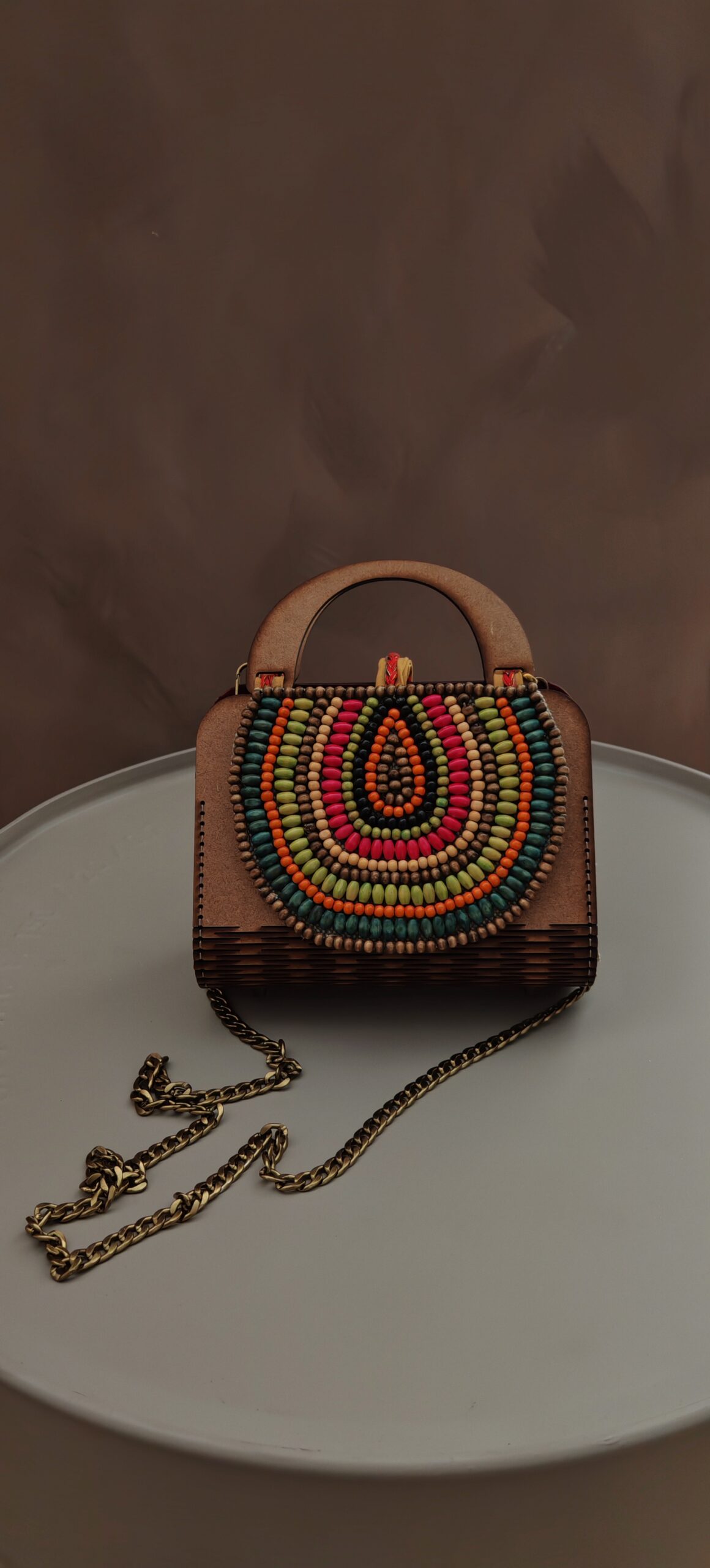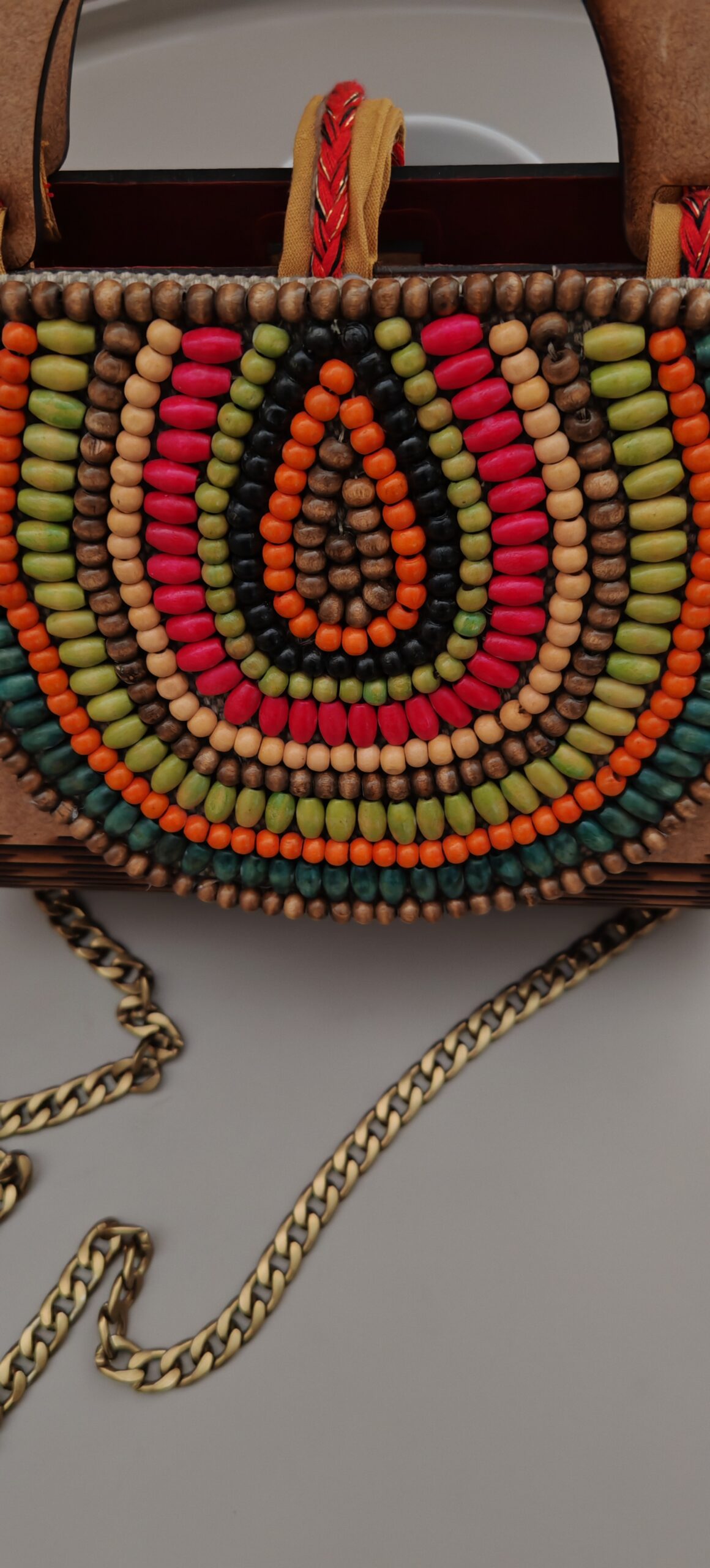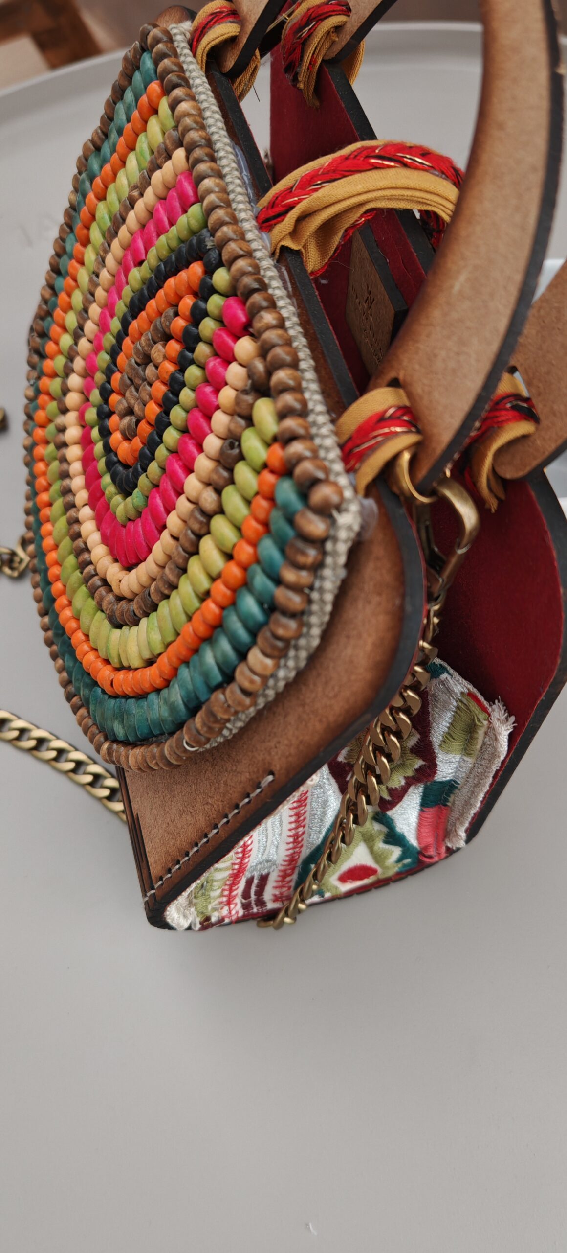 La combinación con cuentas de madera, provenientes de un antiguo bolso olvidado, y los textiles laterales rescatados de una falda recuperada, añade un toque de sensibilidad y diferenciación, haciendo de este bolso una pieza irrepetible, cargada de emociones profundas. Las asas de madera y la cadena metálica no solo aportan practicidad y comodidad, sino que también simbolizan la unión entre pasado y presente, entre lo artesanal y lo contemporáneo.